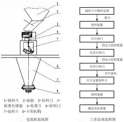 該顆粒包裝機由機架、給料器、稱料斗和電氣箱四部分組成。在對塑料顆粒、糧食、種子、炒貨、飼料等顆粒包裝工作開始時,本顆粒定量包裝機兩臺給料器同時對稱料斗喂料,喂料過程由控制儀表通過對傳感器輸出信號連續采樣,并隨時與大投值比較,當料重不小于大投值時,自動停止大投給料器,剩下一臺小投給料器繼續細喂料,并與目標值比較,當料重接近目標值時(稱重值=目標值-落差值),停止喂料,等待操作者套袋,有套袋操作時,感應開關向儀表送出開關信號,塑料顆粒包裝機卸料,無套袋操作時機器等待,直至套袋卸料。